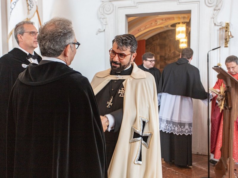Nach dem Pontifikalamt mit Hochmeister Frank Bayard OT, welches musikalisch durch den Weyeraner Kirchenchor gestaltet wurde, kamen Ordensbrüder der Provinzen Deutschland, Tschechien und Südtirol, Familiare, Freunde und Angehörige der beiden Neuprofessen im Klosterhof zusammen.